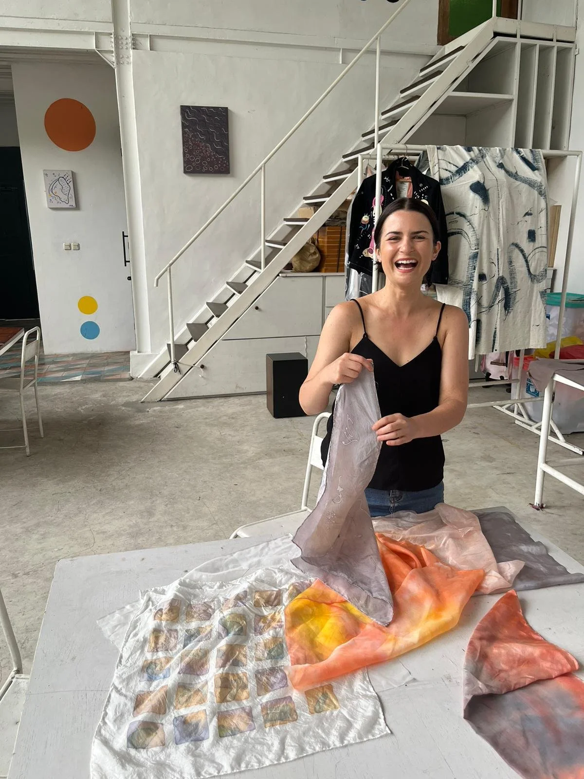 Embracing the silk’s receptive nature, she layers and blends inks to evoke subtle, nuanced hues which allows the colours to organically merge and interplay. The pieces have harmonious tones that breathe and shift with the light which creates an ethereal and dream-like quality. These artworks are aimed to add a meditative element to the space and evoke a sense of tranquillity.